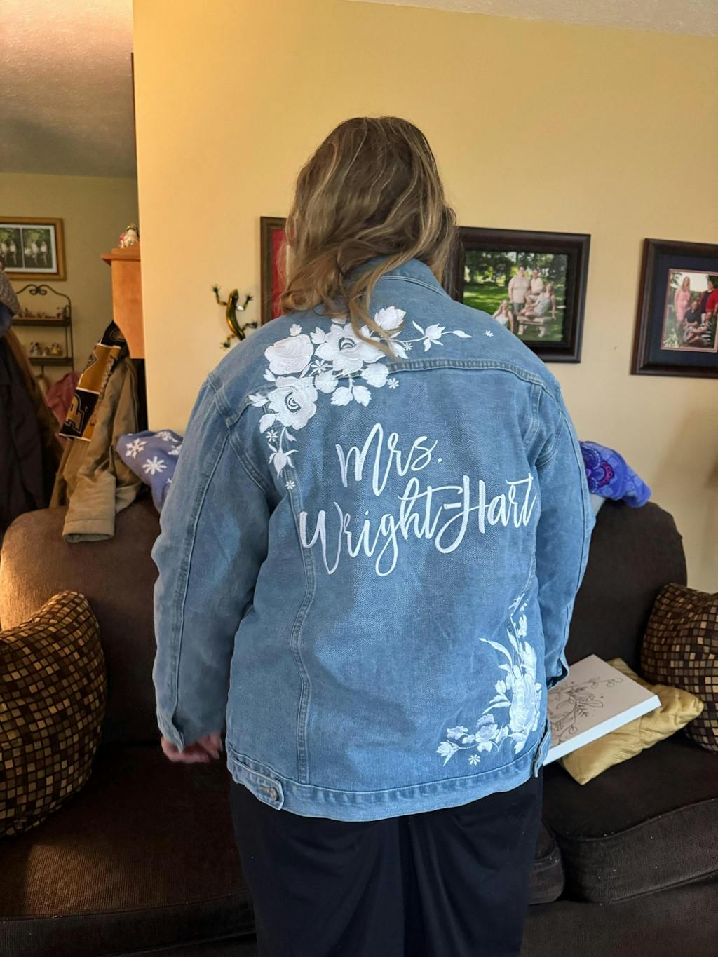 To add text under the collar or to the jacket's cuff, please add this additional listing to your cart: https://www.dearlythreaded.com/collections/denim-jackets/products/add-wedding-date-to-jacket-cuff-or-under-collar